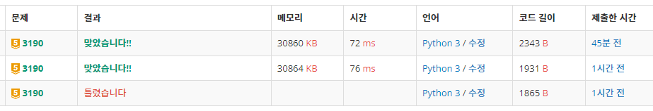 else: # ๋ฒฝ์ ๋ถ๋ชํ๋ฉด ๊ฒ์ ๋
