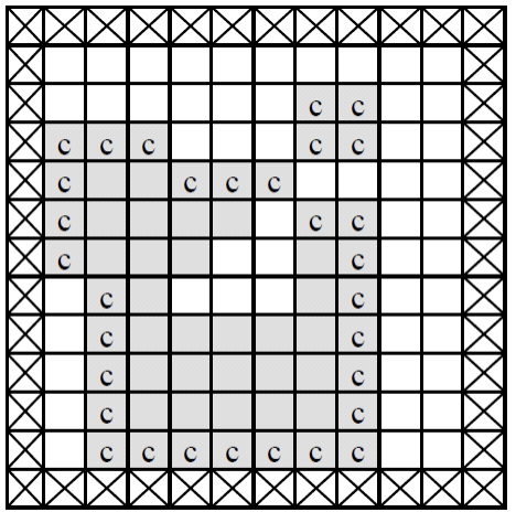 ์๋ <๊ทธ๋ฆผ 1>๊ณผ ๊ฐ์ด ์ ์ฌ๊ฐํ ์นธ๋ค๋ก ์ด๋ฃจ์ด์ง ์ฌ๊ฐํ ๋ชจ์์ ํ์ด ์๊ณ , ๊ทธ ์์ ์์ ์น์ฆ(ํ์์ผ๋ก ํ์๋ ๋ถ๋ถ)๊ฐ ๋์ฌ ์๋ค. ํ์ ๊ฐ์ฅ์๋ฆฌ(<๊ทธ๋ฆผ 1>์์ ๋ค๋ชจ ์นธ์ X ์น ๋ถ๋ถ)์๋ ์น์ฆ๊ฐ ๋์ฌ ์์ง ์์ผ๋ฉฐ ์น์ฆ์๋ ํ๋ ์ด์์ ๊ตฌ๋ฉ์ด ์์ ์ ์๋ค.