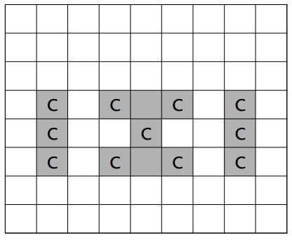 N×M์ ๋ชจ๋์ข ์ด ์์ ์์ฃผ ์์ ์น์ฆ๊ฐ <๊ทธ๋ฆผ 1>๊ณผ ๊ฐ์ด ํ์๋์ด ์๋ค. ๋จ, N ์ ์ธ๋ก ๊ฒฉ์์ ์์ด๊ณ , M ์ ๊ฐ๋ก ๊ฒฉ์์ ์์ด๋ค. ์ด ์น์ฆ๋ ๋๋ ๋ณด๊ด์ ํด์ผ๋ง ํ๋๋ฐ ์ค๋ด์จ๋์ ๋ด์ด๋์ผ๋ฉด ๊ณต๊ธฐ์ ์ ์ดํ์ฌ ์ฒ์ฒํ ๋ น๋๋ค. ๊ทธ๋ฐ๋ฐ ์ด๋ฌํ ๋ชจ๋์ข ์ด ๋ชจ์์ ์น์ฆ์์ ๊ฐ ์น์ฆ ๊ฒฉ์(์ ์ ์ ์ฌ๊ฐํ ๋ชจ์)์ 4 ๋ณ ์ค์์ ์ ์ด๋ 2 ๋ณ ์ด์์ด ์ค๋ด์จ๋์ ๊ณต๊ธฐ์ ์ ์ดํ ๊ฒ์ ์ ํํ ํ ์๊ฐ ๋ง์ ๋ น์ ์์ด์ ธ ๋ฒ๋ฆฐ๋ค. ๋ฐ๋ผ์ ์๋ <๊ทธ๋ฆผ 1> ๋ชจ์๊ณผ ๊ฐ์ ์น์ฆ(ํ์์ผ๋ก ํ์๋ ๋ถ๋ถ)๋ผ๋ฉด C๋ก ํ์๋ ๋ชจ๋ ์น์ฆ ๊ฒฉ์๋ ํ ์๊ฐ ํ์ ์ฌ๋ผ์ง๋ค.