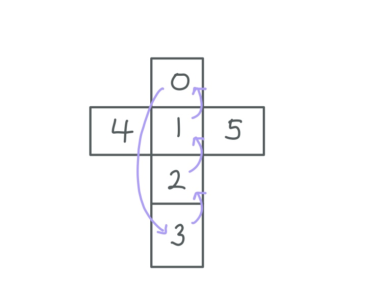 ์ฃผ์ฌ์๋ ์ง๋ ์์ ์ ๋ฉด์ด 1์ด๊ณ , ๋์ชฝ์ ๋ฐ๋ผ๋ณด๋ ๋ฐฉํฅ์ด 3์ธ ์ํ๋ก ๋์ฌ์ ธ ์์ผ๋ฉฐ, ๋์ฌ์ ธ ์๋ ๊ณณ์ ์ขํ๋ (1, 1)์ด๋ค. ์ง๋์ ๊ฐ ์นธ์๋ ์ ์๊ฐ ํ๋์ฉ ์๋ค. ๊ฐ์ฅ ์ฒ์์ ์ฃผ์ฌ์์ ์ด๋ ๋ฐฉํฅ์ ๋์ชฝ์ด๋ค. ์ฃผ์ฌ์์ ์ด๋ ํ ๋ฒ์ ๋ค์๊ณผ ๊ฐ์ ๋ฐฉ์์ผ๋ก ์ด๋ฃจ์ด์ง๋ค.