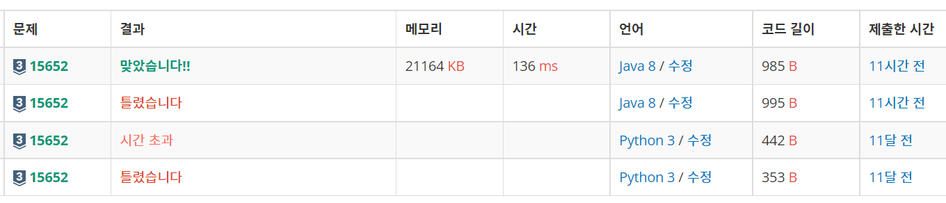 ์ฒซ์งธ ์ค์ ์์ฐ์ N๊ณผ M์ด ์ฃผ์ด์ง๋ค. (1 ≤ M ≤ N ≤ 8)