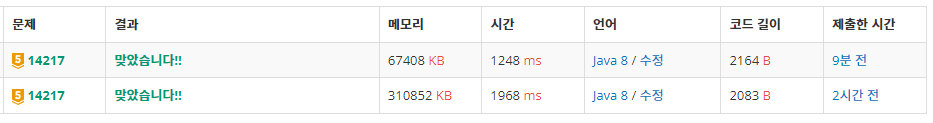 ๋ฌธ์ ํ์ด์์ ๋งํ ๋ ๊ฐ์ง ๋ฐฉ๋ฒ์ผ๋ก ๋ฌธ์ ๋ฅผ ํด๊ฒฐํด ๋ดค๋ค. ์๊ฐ ์ฐจ์ด๊ฐ ๋๋ ๊ฒ์ ํ์ธํ ์ ์์๋ค.