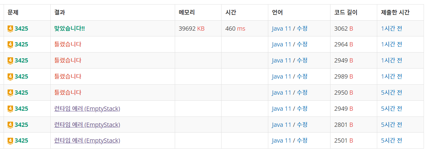 stack을 사용해서 문제를 해결하며 예외 조건을 잘 구현해야 한다.