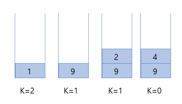 위의 그림과 같이 처음에 1을 stack에 넣어준다. 그다음 값이 9일 때 stack에 들어있는 값이 1 이므로 1을 빼고 9를 넣으면 더 큰 값을 만들 수 있다. 2는 9보다 작으므로 stack에 넣어준다. 마지막으로 4가 들어올 때 2보다 크므로 2를 빼주고 4를 넣어준다.