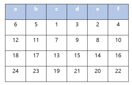 ๋ง์ฝ ์ฃผ์ด์ง ํค๊ฐ cedfba๋ผ๋ฉด ์ํธ๋ฌธ์ ๊ตฌํ ๋ ์ ๋ ฌ๋ ํค ๊ฐ์ abcdef๊ฐ ๋๋ฉฐ ์ํธ๋ฌธ์ ๋ค์๊ณผ ๊ฐ์ ๋ฐฉํฅ์ผ๋ก ์ฑ์ด๋ค.